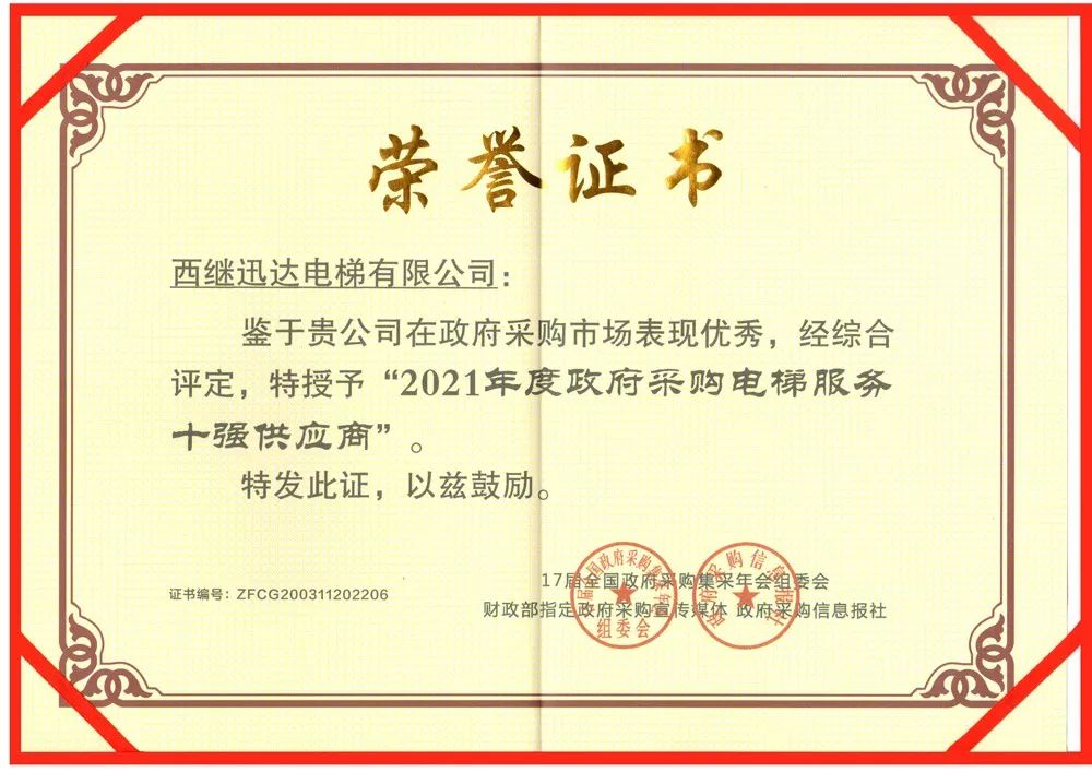 西繼迅達(dá)電梯在眾多參評(píng)整梯供應(yīng)商中脫穎而出,蟬聯(lián)年度“全國(guó)政府采購(gòu)電梯十佳供應(yīng)商”、“全國(guó)政府采購(gòu)電梯服務(wù)十強(qiáng)供應(yīng)商”、“全國(guó)政府采購(gòu)舊樓加裝電梯首選品牌”獎(jiǎng)項(xiàng)。三項(xiàng)電梯行業(yè)大獎(jiǎng)的獲得,充分印證了行業(yè)專家和政采市場(chǎng)對(duì)西繼迅達(dá)的高度認(rèn)可和充分肯定。