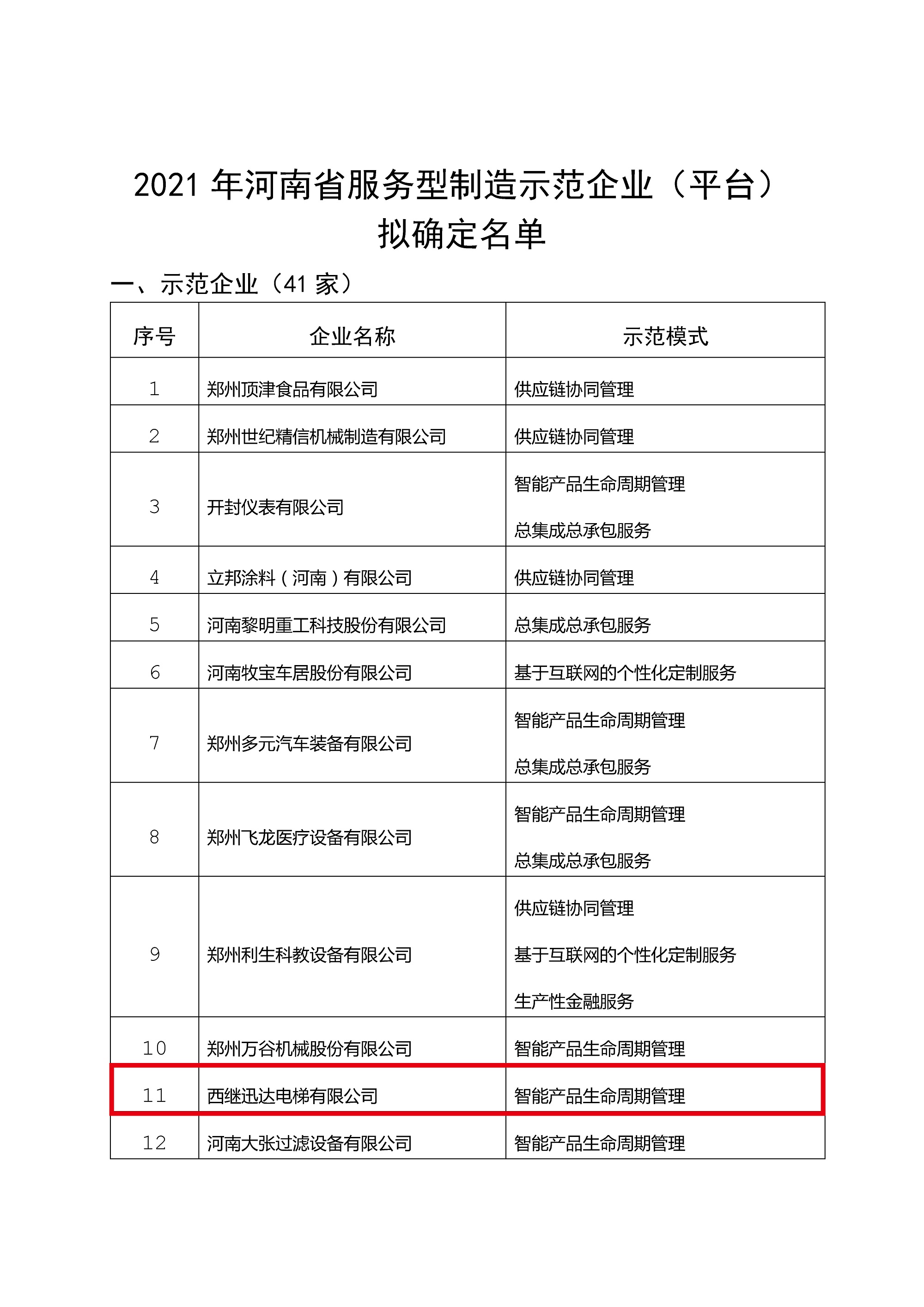 10月11日,省工信廳公示了2021年河南省服務型制造示范企業擬確定名單,西繼迅達位列此次示范企業公示名單。