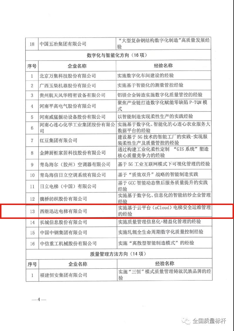 “全國質量標桿”是由工業和信息化部主導、中國質量協會具體組織的全國性質量獎項,代表著全國范圍內質量管理的先進水平,具有可借鑒、可推廣的示范效應。西繼迅達此次成功入選“全國質量標桿”,是公司長期重視技術創新、質量提升、標準引領的成果,未來西繼迅達將在創新道路上不斷進取,致力于打造數字化、標準制度化、高質量化、服務效率化的用戶體驗,使西繼迅達的電梯產品運行更加安全、更加可靠,為客戶提供全方位的乘梯保障。