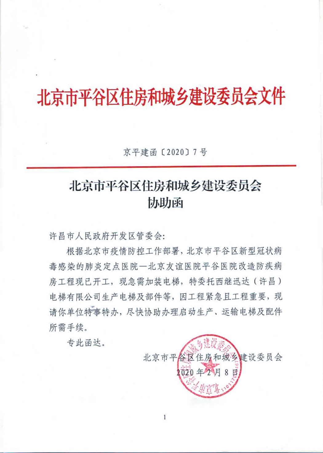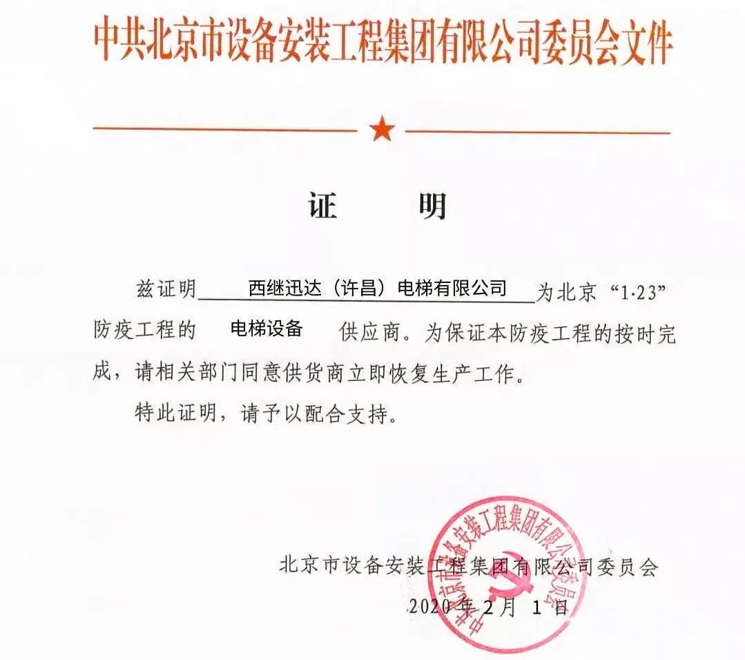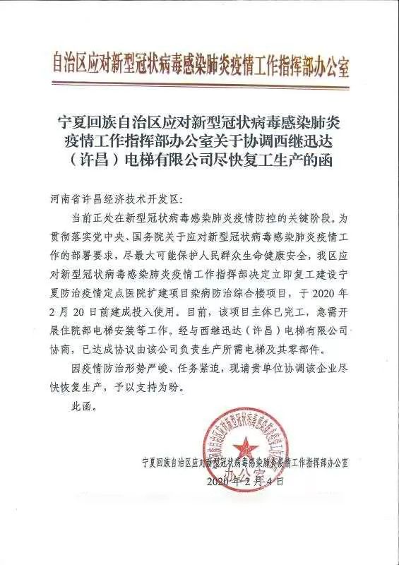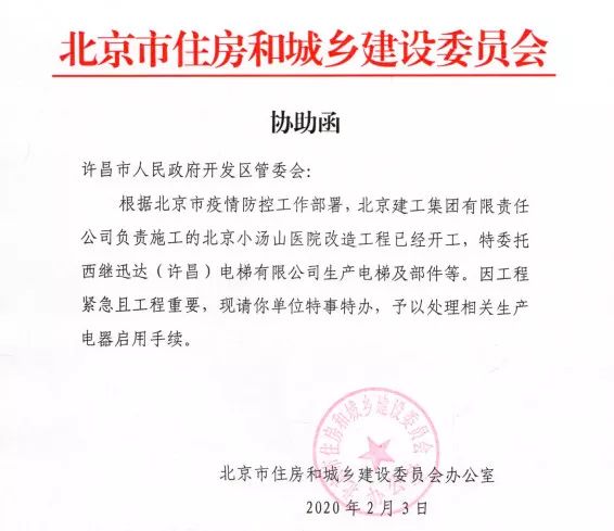 北京市住房和城鄉(xiāng)建設委員會給許昌市開發(fā)區(qū)管委會發(fā)來協(xié)助函,根據(jù)北京疫情防控工作部署,北京小湯山醫(yī)院改造工程已經(jīng)開工,委托西繼迅達生產(chǎn)電梯及部件。因工程緊急,特事特辦,予以提前復工。