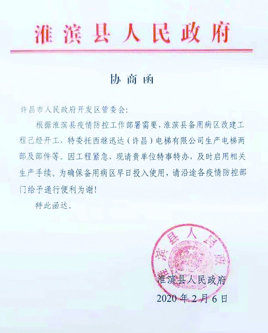 2月6日:淮濱縣人民政府發(fā)來函件,根據(jù)淮濱縣疫情防控工作部署需要,淮濱縣人民醫(yī)院康寧醫(yī)院急需開展改建工程電梯安裝工作,特委托西繼迅達盡快安排生產(chǎn)電梯及部件等。