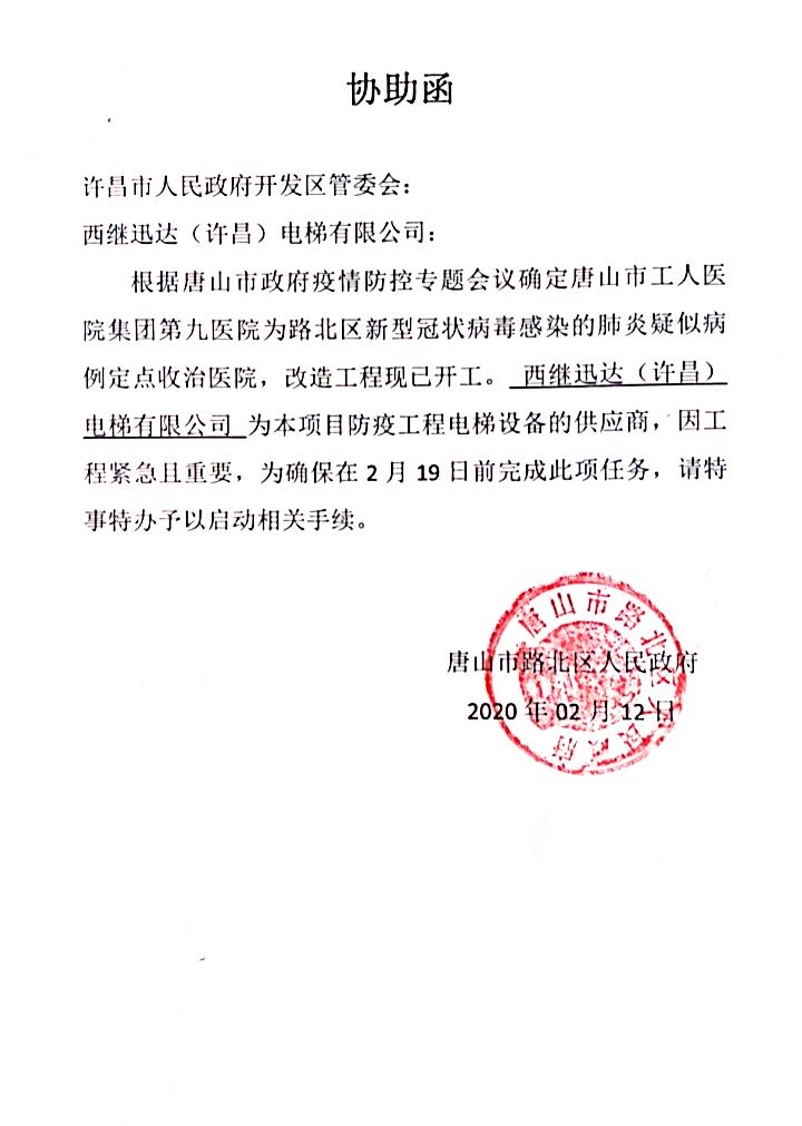 2月12日:唐山市路北區(qū)人民政府發(fā)來函件,為應對疫情而確定的路北區(qū)疑似病例定點收治醫(yī)院,唐山市工人醫(yī)院集團第九醫(yī)院急需開展改造工程電梯安裝工作,西繼迅達為該項目防疫工程電梯設備的供應商,為確保項目建設進度需要,希望西繼迅達盡快安排生產(chǎn)。