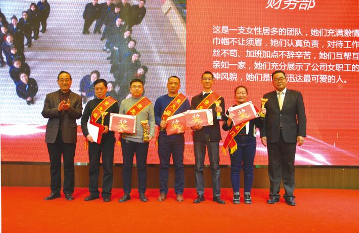隨后,公司副總經(jīng)理、工會主席陳衛(wèi)東宣讀了《關(guān)于表彰2018年度工會工作先進(jìn)部門和先進(jìn)個人的決定》,為表彰先進(jìn),弘揚(yáng)正氣,公司對于2018年度涌現(xiàn)出來的5個先進(jìn)部門、32名首席員工、8名巾幗標(biāo)兵予以通報表彰。頒獎典禮上,在歡樂激昂的的樂曲聲中,劉董事長和劉總經(jīng)理親自為先進(jìn)部門、首席員工和巾幗標(biāo)兵頒發(fā)榮譽(yù)證書、獎杯、獎金或獎品,并興致勃勃地與先進(jìn)部門、首席員工、巾幗標(biāo)兵合影留念。