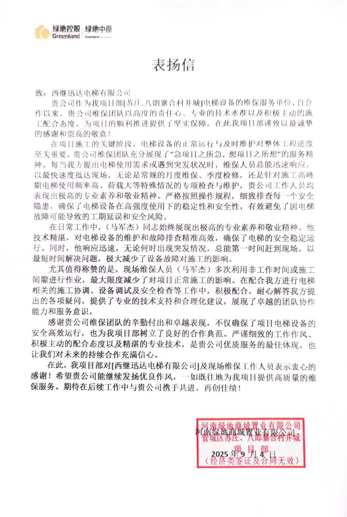 近日,一封來(lái)自河南綠地商城置業(yè)有限公司項(xiàng)目的表?yè)P(yáng)信送至西繼迅達(dá)電梯公司。信中表達(dá)了對(duì)西繼迅達(dá)維保服務(wù)項(xiàng)目團(tuán)隊(duì)的肯定和感謝,對(duì)秉承客戶至上的精神、高主動(dòng)性的服務(wù),獲得項(xiàng)目方的信任與贊賞。并希望公司能繼續(xù)以客戶至上的精神,為項(xiàng)目提供更好、更專業(yè)的技術(shù)支持和服務(wù)!